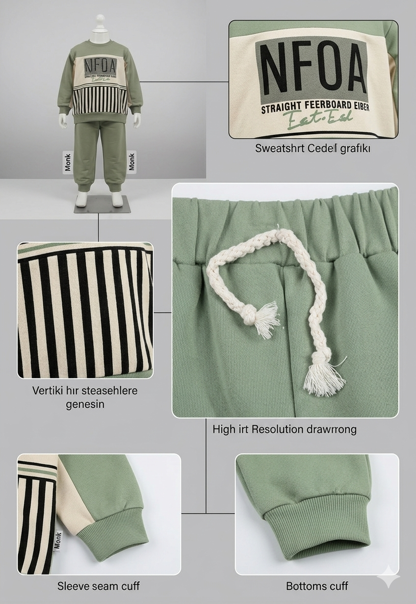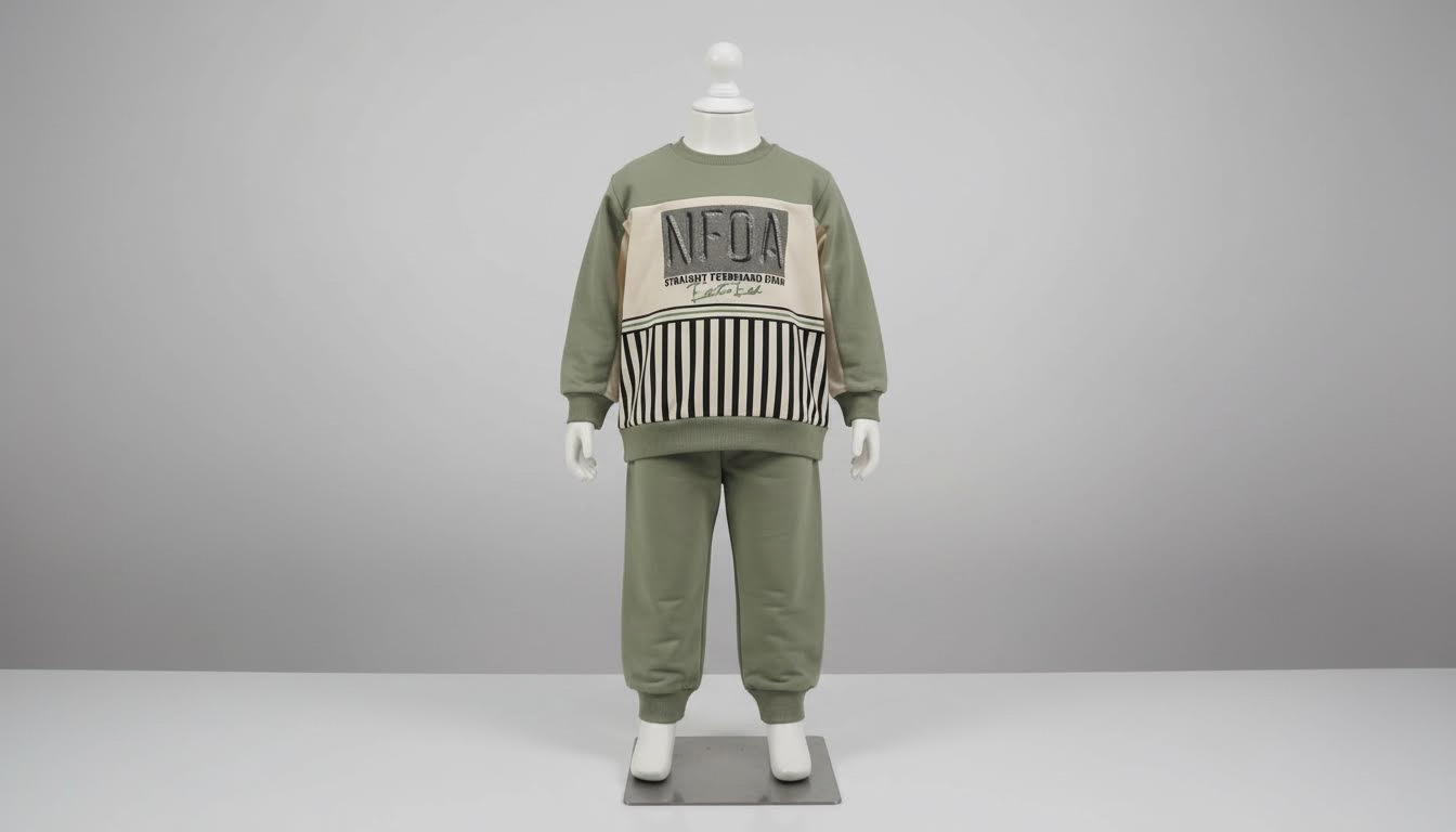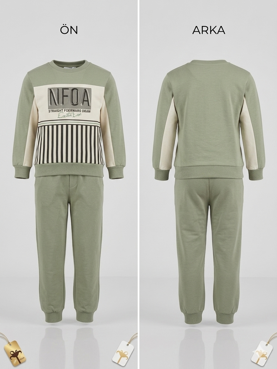 Erkek çocuklar için özel tasarlanmış pamuklu yeşil eşofman takımı, yumuşak ve nefes alabilen kumaşıyla gün boyu konfor sağlar.